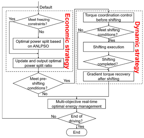 - From the perspective of improving energy efficiency, an economic strategy based on ANLPSO and the freezing tolerance mechanism was designed to achieve optimal power distribution of two motors and reduce the frequent fluctuation of power split ratio. To realize flexible torque response, a dynamic strategy based on the pre-shifting recognition mechanism and gradient torque recovery strategy was proposed. Besides, smooth switching logic was created to guarantee a seamless transition between the two strategies.