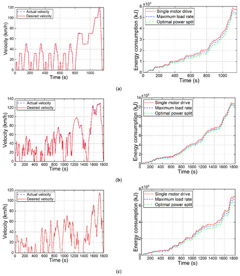 - Simulation results of the standard driving cycle indicate that the setting of a 1% freezing tolerance constraint can greatly reduce the fluctuation of power split ratio and computation time, with a slight sacrifice in energy efficiency. Compared with the single-motor drive strategy and maximum load rate strategy, the proposed strategy can reduce energy consumption by 8.1% and 2.49%, 4.02% and 0.92%, and 9.49% and 2.43% under NEDC, WLTC, and CLTC, respectively.