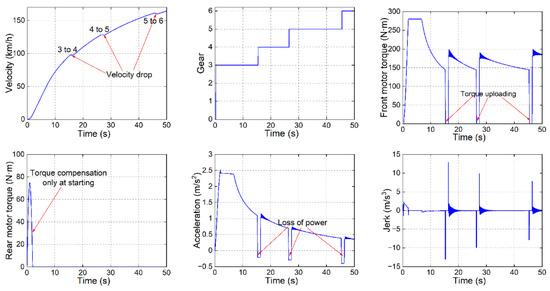 Figure 13 depicts the velocity, gear, torque change, longitudinal acceleration, and jerk simulation results of full load acceleration without the dynamic strategy. Under full throttle pedal opening conditions, the vehicle accelerates to its maximum velocity, and the transmission shifts gear when the shifting condition is met. The average time for gear shifting is about 1.3 s. As the input torque of the transmission must be zero before shifting, the front motor’s torque is unloaded and the vehicle loses power, resulting in a velocity drop during shifting, thereby diminishing the vehicle’s dynamic performance. When shifting is complete, the front motor’s torque is directly recovered to its target value, resulting in a significant increase in vehicle impact. The maximum jerk reaches 13.03 m/s3, 9.9 m/s3, and 7.86 m/s3 in the shifting processes of 3 to 4, 4 to 5, and 5 to 6, respectively, which negatively impacts the comfort performance.