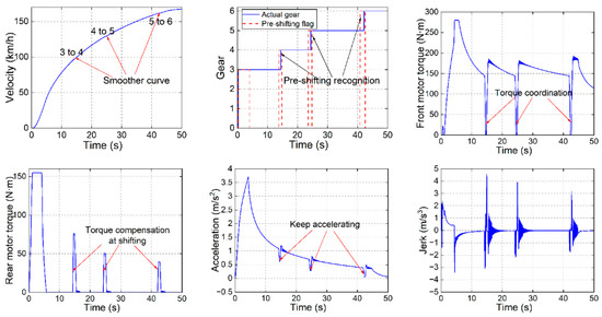 Figure 14 illustrates the simulation results of full load acceleration with the dynamic strategy. The pre-shifting recognition mechanism can reliably predict the actual gear shifting time and transfer torque gradually from the front motor to the rear motor before gear shifting. Due to the torque compensation of the rear motor, the powertrain retains a certain amount of output torque when shifting, allowing the vehicle to continue accelerating at a small acceleration. The velocity trajectory is therefore relatively smooth. When shifting is complete, the torque of the rear motor is transferred progressively to the front motor. The front motor’s torque is smoothly recovered to its target value based on the torque gradient of the respective gear. The vehicle impact during shifting is significantly reduced. The maximum jerk is reduced to 4.57 m/s3, 3.92 m/s3, and 3.18 m/s3 in the shifting processes of 3 to 4, 4 to 5, and 5 to 6, respectively, which are all within the acceptable impact limit for humans.