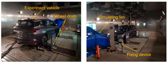 As shown in Figure 15, the four-wheel drum bench primarily consists of a chassis dynamometer, circulating fan, environmental bin, and fixed device. The chassis dynamometer simulates road driving resistance through the drum, and the circulating fan simulates road conditions. The experiment procedures refer to GB/T 18352.6-2016, GB/T 19753-2013, and GB/T 19753-2021 in China. During the experiment, the vehicle is attached to the drum bench, and a power analyzer is used to measure and calculate the vehicle’s energy consumption. The vehicle has been powered up at high voltage. The initial battery SOC is 80%, and the shifting lever is in forward gear. The experiment environment setting is displayed in Table 5. The setting of pressure, ambient temperature, and relative humidity strictly refers to GB/T 18352.6-2016 in China. The drag coefficients are obtained through a coast-down test based on GB/T 12536-2017. And the driving resistance of the dynamometer can be described as follows: