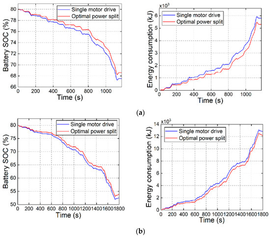 Figure 16 and Table 6 display the experimental results for pure electric energy consumption under NEDC and WLTC. Under the single-motor drive strategy, the load rate of the front motor is relatively low when the demand torque is low, resulting in an increase in driving energy loss. The battery energy consumption is 5815.64 kJ and 12,831.33 kJ, and the energy consumption per 100 km is 14.65 kWh and 15.36 kWh under NEDC and WLTC, respectively. However, the proposed strategy can realize the real-time optimal power distribution of two motors based on driving demand, and its battery SOC is always greater than that of the single-motor strategy. The battery energy consumption is 5305.51 kJ and 12,196.84 kJ, and the energy consumption per 100 km is 13.37 kWh and 14.61 kWh, respectively. Compared with the single-motor drive strategy, the energy consumption is reduced by 8.74% and 4.88%, respectively.