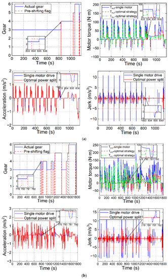 Figure 17 illustrates the comparative results of the torque coordination effect for different strategies under NEDC and WLTC. Under the two strategies, the transmission can shift gear based on the shifting schedule as the velocity changes. Regarding the single-motor drive strategy, the vehicle loses its power, and the vehicle’s impact soars due to the torque unloading of the front motor during shifting. After shifting, the front motor immediately restores its target torque, resulting in a sharp increase in vehicle impact. The maximum jerk reaches 10.87 m/s3 and 11.3 m/s3 under NEDC and WLTC, respectively, which seriously affects the driving quality. As depicted in the zoomed-in areas of Figure 17a,b, the pre-shifting recognition mechanism proposed can accurately predict the shift time. Compared with the single-motor drive strategy, this strategy can transmit the torque of the front motor to the rear motor in advance. Even though the acceleration fluctuates during the shifting process, the vehicle is still able to accelerate with sufficient power, and the influence caused by the torque change of the front motor has been significantly reduced. The maximum jerk is reduced to 5.99 m/s3 and 8.29 m/s3, which are all within the comfort limit of humans.