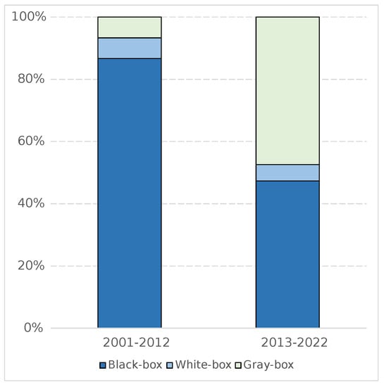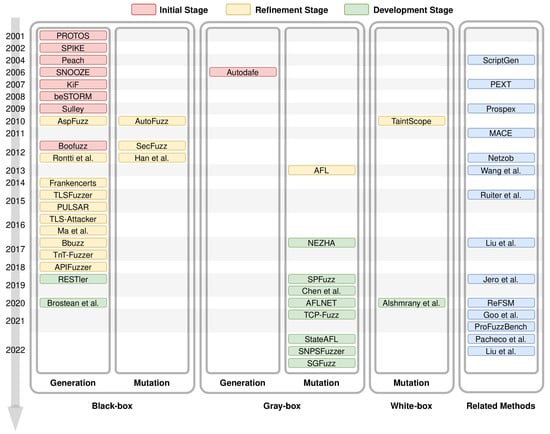 It can be observed from Figure 2 that, prior to 2017, the majority of network protocol fuzzing techniques employed generation-based black-box fuzzing methods. However, in the past five years, grey-box fuzzing techniques have experienced rapid development. Additionally, considering factors such as the automation level of test case generation steps and the target of the fuzzer, the development of network protocol fuzzing techniques can be categorized into three stages: the initial stage (2001–2009), refinement stage (2009–2017), and development stage (2017–present).