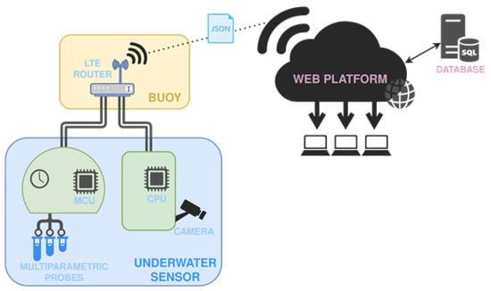 The aim of the monitoring system is to collect data from the on-board sensors and to ensure the long-term monitoring of the most important environmental parameters. The system uses an underwater camera with a special filter for biofouling detection. The camera captures images in the near-infrared frequency range, enabling the calculation of indices such as NDVI [13] and PYM [14]. These provide valuable information on the presence and extent of biofouling on archaeological artifacts. The remote monitoring system also measures important environmental parameters. These include the water temperature, pH, dissolved oxygen, and oxidation-reduction potential (ORP). The system consists of various components, including an underwater node, a surface buoy, and a web platform, as depicted in Figure 1.