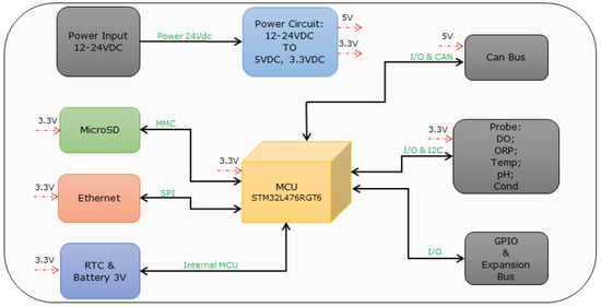To gain a better understanding of the electronic board’s structure, we can refer to the block diagram depicted in Figure 6. This diagram illustrates the main components of the board using macro blocks and highlights the digital protocols utilized, the peripheral devices, as well as the required power supply for the proper functioning of the electronic board.