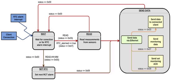 The written firmware acts as depicted in Figure 8. It starts in the WAIT state, in which the MCU waits for the connection of an external client (via Ethernet interface) or waits for an interrupt triggered by an RTC alarm occurrence; in the READ state, the parameters provided by the I2C sensors are retrieved, constructing the message that will be sent to the client in the next state; in SEND DATA, all measurements acquired from the sensors must be sent to those who requested them. This is the only state where communication with the outside occurs, which is why the eventual sending of a confirmation ACK is also managed within this state. SET RTC is the state in which the alarm of the RTC module is configured to schedule a future reading; moreover, an ERROR (not shown in the diagram) was implemented as the state that the system will move to when one of the described states terminates for some reason, e.g., its execution with an error.