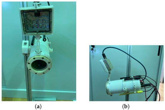 The waterproof external illuminator uses eight high-brightness LEDs. The illuminator support was designed to be attached to the cylindrical case with a double joint, ensuring the best possible orientation towards the surface under investigation. The environmental probes were fixed around the case using a ring with clips. Finally, the remote monitoring system was mounted on an aluminum support with an adjustable sliding interface for height regulation. The final assembly is depicted in Figure 9, showcasing the camera housing, the top-mounted LED illuminator, and the Atlas Scientific probes securely attached around the case.