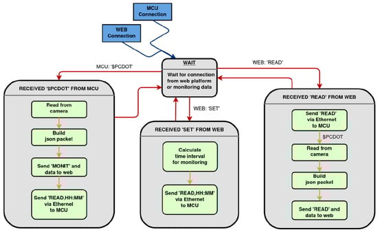 Regarding the software integration, the Raspberry Pi hosts the software implementation that handles the image progessing and environmental data acquisition operations, as well as their transmission to the implemented remote web platform. The system was developed in Python 3 and formalized using a state machine model (Figure 10).