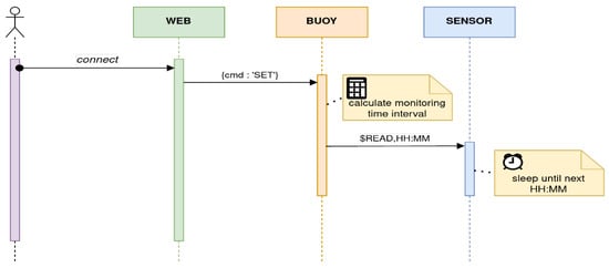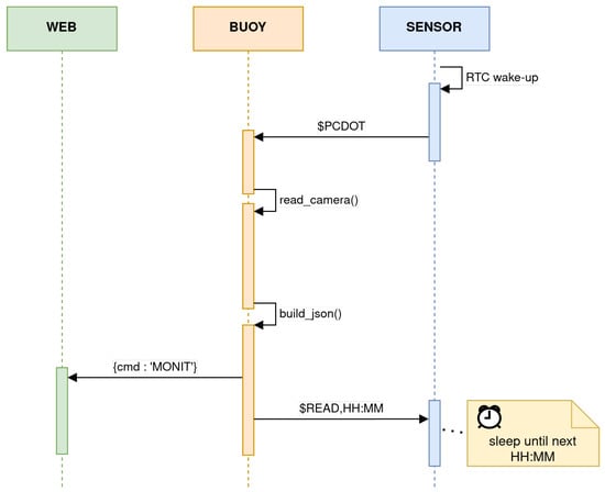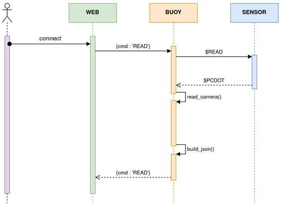 The system operates in a waiting state, referred to as “wait”, where it awaits connections from the web platform or the microcontroller on the sensor board. To implement this state, two software threads have been implemented to simultaneously wait for their respective connections. The main thread initializes and runs a Flask server on the assigned fixed IP address. The second thread remains in a listening state, awaiting socket connections from the microcontroller of the sensor board. The microcontroller transmits and receives messages compliant with the NMEA-0183 data format protocol. Incoming messages from the web platform are directed to the root URL (“/”) using a GET or POST request. Upon receiving a message, the system extracts the accompanying JSON content and specifically retrieves the “cmd” field from the message structure. If an immediate sensor-reading operation has been requested, the application takes the following steps: