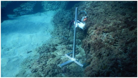 The monitoring system developed during the project was also tested in a real environment at the chosen site, located in S. Irene, Briatico (VV), Italy, at the submerged/emerged archaeological site “Peschiere di S. Irene”. The device enabled the detection of key environmental parameters at the experimental location and the remote real-time supervision of cleaning operations. The system was deployed on the seabed (Figure 14) and connected to the surface buoy through a watertight umbilical cable. The surface buoy, equipped with batteries and a Wi-Fi/LTE router, provided power to the submerged system and ensured data connectivity. The electronic systems were installed inside a waterproof container placed on the mast of the buoy, which was lowered into the sea and anchored to the seabed.