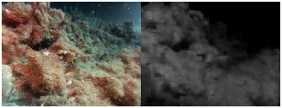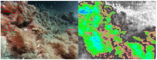 Figure 15 and Figure 16 show a test of image acquisition and the related image elaboration using the NDVI and PYM indices, respectively. As can be seen, in both cases, it was possible to detect the presence of biofouling on the rocks.