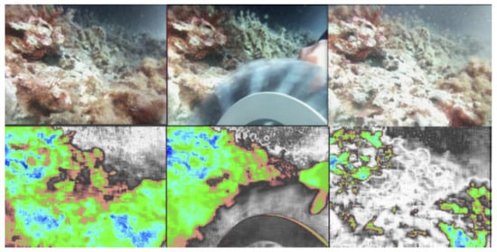 Figure 17 presents a compelling test conducted during the underwater surface cleaning operation. The figure displays a sequence of images, showcasing both the original version and the NDVI version. On the left side, the first image was captured before the cleaning process started. In the center, an image is shown during the cleaning operation with the use of a rotating brush. Finally, on the right side, the image depicts the surface after the cleaning process was completed. The results clearly demonstrate the system’s accurate identification of the areas where biofouling had been successfully mechanically removed.