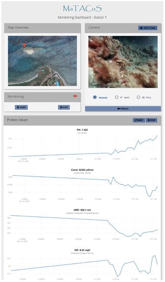 In Figure 18, a screenshot of the web platform during the test campaign is presented. The platform offers the final user access to both image acquisition and sensor probe data. Users have the option to select real-time monitoring and choose the type of displayed image. Additionally, the platform includes geo-localization information about the archaeological site.
