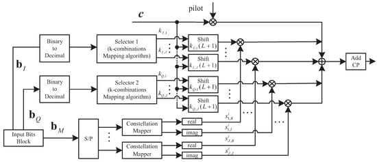 The block diagram of the proposed transmitter is shown in Figure 1. First, the bit stream of a frame is divided into three parts, where and represent the index bits used for index modulation of branches I and Q, respectively, and represents the modulated bits used for MPSK constellation mapping.