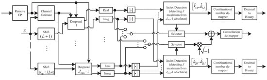 where denotes the energy of spreading sequence . As shown in Figure 2, to obtain the indices of the transmitted sequences, the index detection block is used to find J maximums from the variables . The remaining absolute values are given as . Let and ; when , index detection is correct, so the error probability of in-phase branch index detection can be expressed as