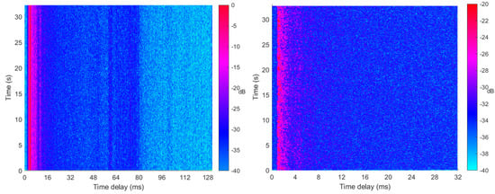 Two kinds of UWA channels are adopted in the simulation experiment. The first channel was measured in a shallow sea of Oslofjorden, with a fixed single source and a fixed single hydrophone. The second channel was measured on a Shelf in Norway, and the transmitter and receiver were also fixed during the test. The channel impulse response (CSI) of the two channels are shown in Figure 4. The left figure characterizes the Fjord channel, whose delay profile decays quickly, and a cluster of discrete path arrivals is observed between 50 ms and 80 ms, however, these paths only carry a small fraction of the total energy. The stable channel paths carry about of received signal energy. It is a benign channel on the whole. In contrast, the Shelf channel has a larger Doppler shift.