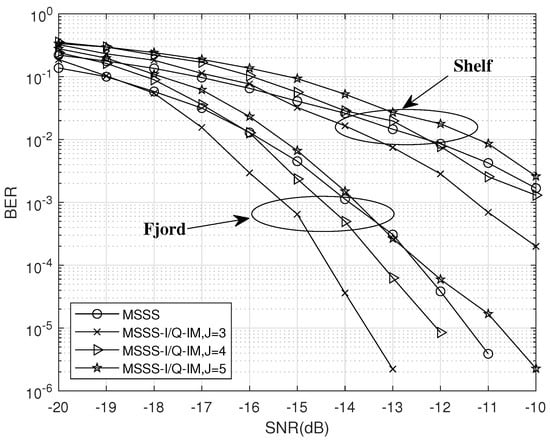 Figure 5 analyzes the influence of parameter J on the BER performance of the systems under the two UWA channels. The length of spreading sequence , and the cyclic shift step size chips. From the overall trend of the curves, the BER over the Fjord channel is better than that over the Shelf channel. When , compared with the MSSS system, the MSSS-I/Q-IM system has been able to achieve better BER performance in both UWA channels. In addition, the BER performance gain is larger over the Fjord channel, which means that with the increasing of channel complexity, the performance advantage that the MSSS-I/Q-IM system achieved will decrease. However, according to the influence of J on the BER performance, it indicates that the MSSS-I/Q-IM system has more flexibility.