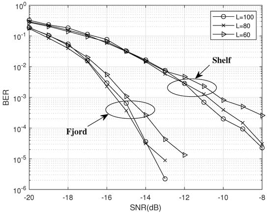 Figure 6 shows the effect of different cyclic shift step sizes on the BER performance of the proposed system. Other parameters are set to and . In the simulation, the cyclic prefix length is set to 100, and under different L values, the effective bit rates of the MSSS-I/Q-IM system are the same, at bit/s. As shown in the figure, there is a gap in the BER performance under different shift step sizes. Comparing the BER curves when and over the two UWA channels, the difference between them is small. However, for , the BER performance drops significantly. The reason is that when the shift step size is too small, the inter-symbol interference (ISI) of the superimposed sequences is greatly increased. On the other side, when the shift step size is too large, the accuracy of the channel estimation will be reduced by the influence of L. Therefore, the shift step size not only affects the BER performance, but also affects the data rate.