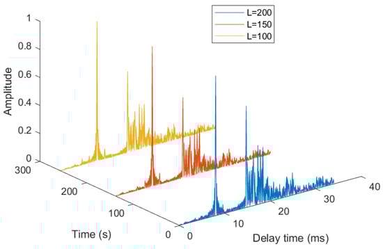 Through the correlation calculation of the synchronization signal, the CIRs of the channel can be estimated. In the experiment, information blocks with different parameter conditions are concatenated together to form a data packet for transmission. In addition, a synchronization signal is added before each block to estimate the CIRs. Figure 7 shows the CIRs of a data packet at different times. It can be seen from the figure that the channel has a weak variability with time and a large number of multipaths.