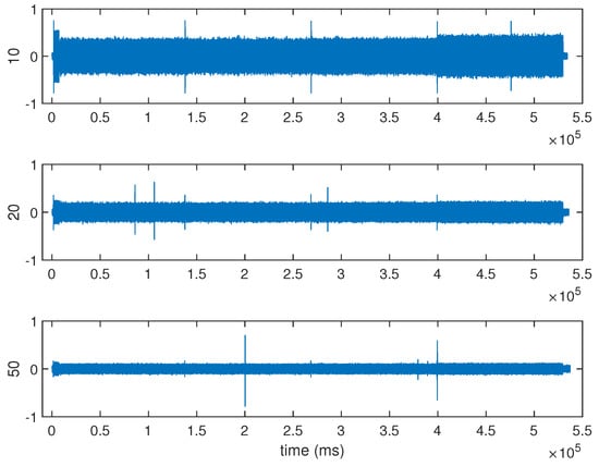 In the experiments, due to the use of the attenuator, the amplitude of the signal can be adjusted flexibly. Figure 8 shows the waveform of the received signal for a data packet under different attenuation factors; the attenuation factors are 10, 20, and 50.