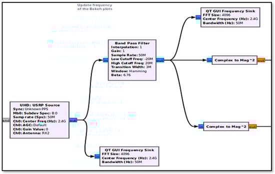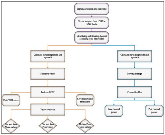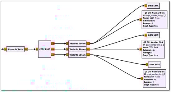 GNU Radio is an open-source software development toolkit that enables the efficient design and implementation of software-defined radios (SDRs) and wireless communication systems through a wide range of signal-processing blocks []. It is written in the Python and C++ programming languages. GNU Radio provides a large collection of signal processing blocks for a variety of tasks such as modulation, demodulation, filtering, and coding. These blocks can be used to build custom communication systems, such as those for wireless communications, digital signal processing, and software-defined radio. The blocks can be combined and connected in a variety of ways to form a flowchart that represents the structure of the processing system. In the development of the CCDF and CP measurement application, the workflow (Figure 2) was divided into three stages: sample reception, filtering and spectrum monitoring (Figure 3), CP measurement, display and data save (Figure 4), CCDF calculation and plotting (Figure 5).