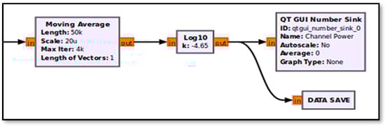 In the second step (Figure 4), to measure the channel power, we need the Moving Average block, which helps to calculate the moving average of a specific time slice. Next, the values are converted to dBm using a correction factor that is modified according to the reference equipment, and the result is displayed using Number Sink and saved to a .csv file using the Data Save block. The save block does not exist in the GNU Radio library and was developed for this application using a Python script.