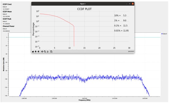 Figure 6 shows the final result of the software implementation when analyzing a wireless channel with a bandwidth of 40 MHz. On the main screen, the filtered wireless channel is displayed in the frequency domain, and on the left side, the parameters such as the Crest, Mean, Peak and Channel Power are also displayed. The second screen shows the CCDF graph, with the amplitude above the mean signal value (in dB) plotted on the Ox axis and the percentage of time the signal reached the corresponding amplitude level (in %) on the Oy axis. The four most significant indicators are extracted as pairs of percentages (10%, 1%, 0.1%, 0.01%)—amplitude above mean (dB) in the right area of the graph, as can be observed in Figure 6.