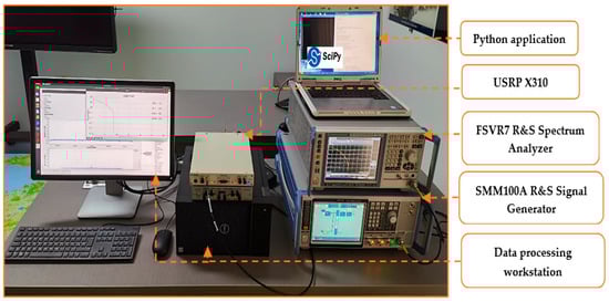 To ensure real-time measurement capability and high flexibility in the development of the monitoring system, the main starting point was to use the Universal Software Radio Peripheral (USRP)—an SDR platform from Ettus Research—together with the GNU Radio Companion software, upgraded with some custom blocks developed in Python scripts. Based on this concept, a computer was assembled with the Linux operating system (Ubuntu 20.04) and GNU Radio installed. The USRP X310 was also chosen as the SDR platform, with a UBX 10-6000 MHz Rx/Tx receiver board with a full-duplex wideband transceiver and an instantaneous bandwidth of up to 160 MHz. The main features of this SDR are shown in Table 1 [].