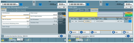 The test signals were verified by comparison with the Rohde and Schwarz FSVR7 real-time SA (frequency range 10 Hz–7 GHz). The R&S SMM100A vector signal generator equipped with the SMM-K142 for the IEEE802.11ax standard was used for signal generation. Parameterization was performed for a downlink channel with a bandwidth of 40 MHz (the bandwidth was selected for comparison with the SA, which is limited to 40 MHz real-time acquisition). The other set of parameters that define the 802.11ax standard are highlighted in Table 2 and Figure 8. To determine the correct parameters for the SDR system, comparative measurements were performed.