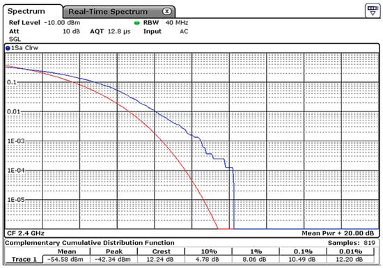 However, the interest in peak values and signal power statistics makes CCDF statistical measurements very important and not to be neglected in the quasi-stochastic characterization of new signals. Many studies approach the technique of PAPR reduction of OFDM signals using statistical CCDF measurements [,,], but to analyze this parameter in detail, a statistical analysis of its evolution in time is required. CCDF curves are also important in the design of power amplifiers due to the nonlinear nature of some components, as well as for testing and debugging devices to assess compression effects [].