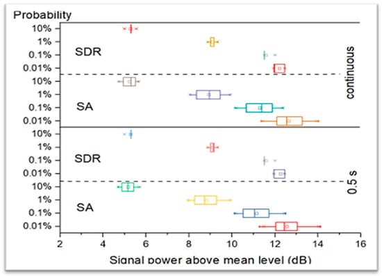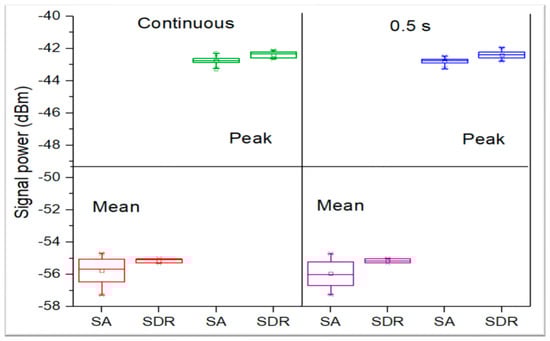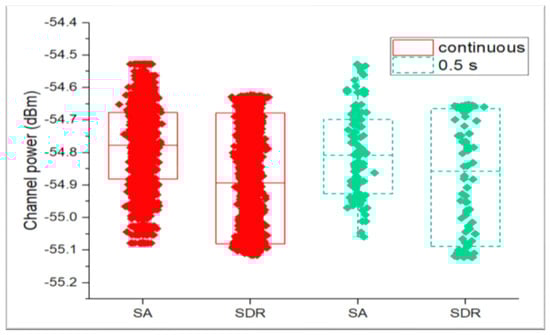 Figure 10 shows the comparative values of the channel power measured by both the SA and the SDR as a boxplot of the channel power variation. In both continuous and 0.5 s averaging cases there is a very narrow gap between the values measured by the SDR and the SA. Most of the values in the whole band measured by the SDR show a very small deviation from the median (<0.2 dB) compared to the reference analyzer.