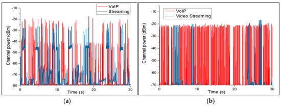 Figure 13 shows the time evolution of the channel power during 30 s for the streaming and VoIP test for LTE-A and 5G standards. In the case of 4G+, in the streaming scenario represented by the blue color, it can be seen how the video is gradually loaded at different timestamps, while in VoIP the signal is somewhat constant. The same can be observed in 5G, wherein the VoIP experiment the signal is kept constant, while in streaming it is observed how it is loaded at 4, 8, 24 and 27 s.