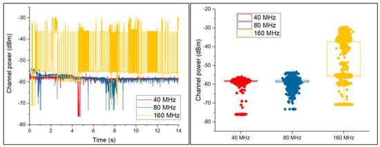 In order to study and test the measurement system to its maximum, several experiments were performed on the IEEE 802.11ax network. The scenario consisted of configuring the router successively to 40/80/160 MHz and downloading a file for each bandwidth. Figure 14 shows the power measurements over time for the three bandwidths. For the scenario described, the channel performance was similar when using 40 MHz and 80 MHz bandwidths with slightly higher CP values being measured for 80 MHz. The increase in CP with channel bandwidth is more visible when a 160 MHz bandwidth was used and the measured channel power was visibly higher. This can be explained by the fact that signals with larger bandwidths tend to exhibit higher channel power requirements because, in a wider bandwidth, there are more available frequencies or subcarriers that need to be powered to transmit the signal. It is important to note that while larger bandwidths generally require higher power, advancements in technology and signal processing techniques continue to improve the power efficiency of wideband communication systems. These advancements aim to achieve higher data rates and improved performance while minimizing power consumption [].
