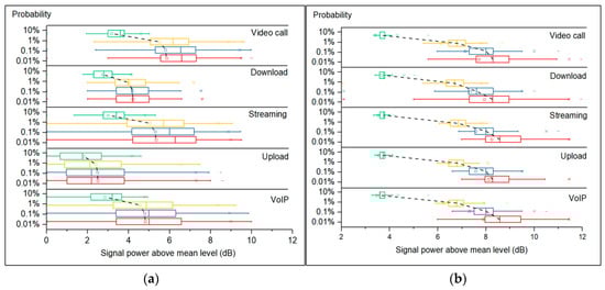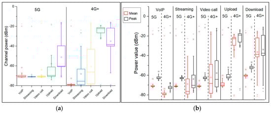 Signal power above average power for 4G+ (a) and 5G (b) application service tests—boxplot representation.