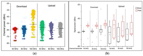 CP (a) and mean and peak signal power (b) for 802.11ax download and upload—boxplot representation.