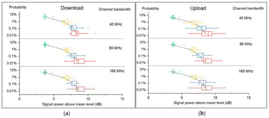 Signal power above mean power for 802.11ax download (a) and upload (b)—boxplot represenation.