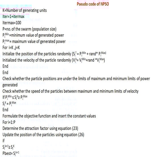 - Initialize the swarm using the minimum and maximum values of the generated power, as given in Equations (17) and (18);