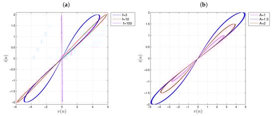 The pinched hysteresis loops are considered as the feature fingerprint to recognize memristors [36]. For the purpose of verifying this excellent characteristic of the established discrete memeristor, we took a discrete sinusoidal voltage with frequency f and amplitude A. Once was held, and f was set to , respectively, the curves were graphed as shown in Figure 1. Eight shaped pinched hysteresis loops at the origin according to various excited frequencies are clearly illustrated in Figure 1a. As the input frequencies increased from 3 to 100, the pinched hysteresis loop decreased step by step and shrank into a single-valued function. When the frequency was kept at , and A was taken as , respectively, the curves were graphed, as shown in Figure 1b, which describes that the pinched hysteresis was obtained regardless of the stimulus amplitude. The numerical findings given in Figure 1a and Figure 1b demonstrate perfectly that the discrete memristor can behave like memristors in the continuous-time domain.