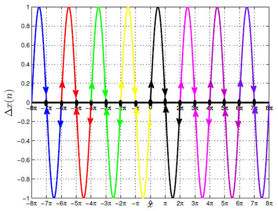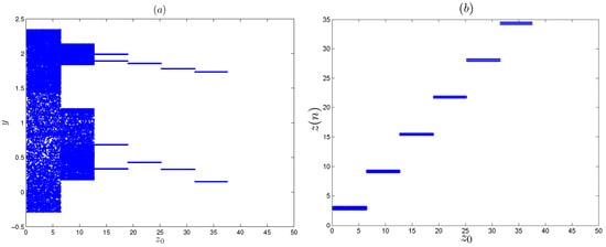 In the same regard, a power-off plot (POP) was applied to reveal the nonvolatile characteristics of the discrete memristor [39]. The POP exhibits the dynamic routes of change versus state-variable by fixing the input voltage to zero. It must be recognized that each intersection of POP with the x-axis is an equilibrium point; those with a negative slope are stable, and the others are unstable. Hence, when , the discrete memristor state Equation (3) becomes:
