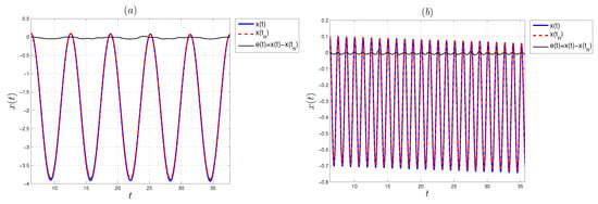 Consider the discrete sinusoidal voltage . Here, we set , and . The continuous , discrete , and error were, respectively, compared for two different values of and , and the images are shown in Figure 4a and Figure 4b, respectively. The results show that and almost coincided. The error was almost zero. It can be seen from Figure 4 that although the continuous and discrete were different in form, when the same parameters were taken, the curves of and almost coincided, and the error curve was almost zero.