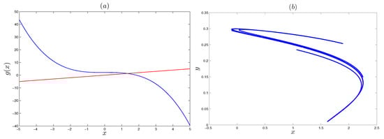(a) Two function curves and their intersections for . (b) The chaotic attractor emerged from the initial value and the system parameters , , , and .