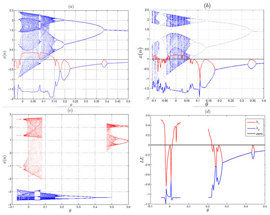 The bifurcation diagram and Lyapunov exponents versus for (a) and (b) . (c) Coexisting bifurcation for and IC (red diagram) and , . (d) Lyapunov exponents corresponding to the bifurcation diagram for the initial condition .