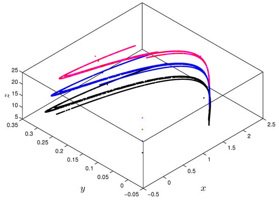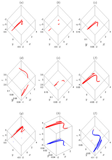 Without loss of generality, the phase portraits at several critical values corresponding to Figure 6 are shown in Figure 7. Thus, the phase diagrams display a type of complex behavior, which is consistent with the dynamics, as demonstrated in Figure 6.