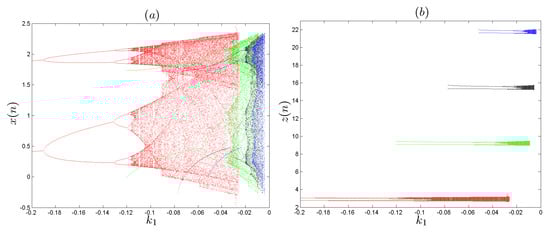 In this section, bifurcation diagrams and phase portraits are used to explore the remarkable phenomenon of the coexistence of three or more dynamical states under different initial states. Under different initial state values, the discrete memristor FHN neuron model can show several kinds of coexisting multiple attractor behaviors in some neighborhoods of parameter . System parameter is adjusted in the region , the initial values of the neuron model and are set as and , respectively, the memsristor initial value is selected, respectively, as , , and , and the discrete memristor neuron parameters are fixed as , , , and . Accordingly, four kinds of bifurcation diagrams in the and planes are depicted in Figure 8a and Figure 8b, respectively, with different color regions. Obviously, we can find that the discrete memristor FHN neuron model can exhibit four states of coexisting attractors, including coexisting periodic attractors and coexisting chaotic attractors. Figure 8 shows that changing the initial state significantly changes the size and state of the bifurcation diagram under the same parameters. Basically, when the initial condition was assigned to , the discrete FHN neuron model (12) changed from a periodic state to a chaotic state via the period doubling bifurcation route, Furthermore, it is found that the bifurcation behaviors were similar to the rest of the initial values , , and . In addition, it can be observed that the chaotic intervals corresponding to the initial values were obviously different. For instance, when , the chaotic interval was located in . However, when the initial state was changed to 4, the hidden chaotic interval was located at .
