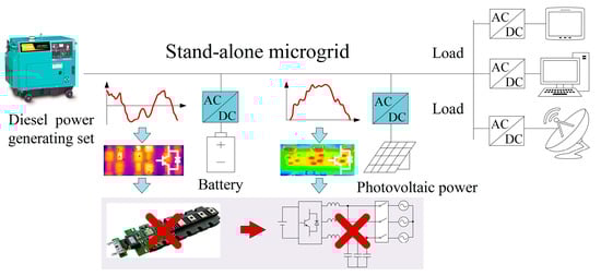 Stand-alone microgrids are pivotal in integrating distributed power supply systems to provide electricity to regions lacking grid coverage. These microgrid systems have been widely adopted in various applications, including remote islands, border guard posts, and field camps [1,2,3]. Power electronic converters, as essential equipment in the microgrid, are responsible for producing, transforming, and utilizing the electrical energy within the system. However, these critical converters are exposed to complex power fluctuations due to intermittent distributed generation and random load shifting. Research has indicated that thermal cycling caused by power fluctuations can lead to thermal stress fatigue between different material layers within power semiconductor devices [4,5,6,7]. Prolonged accumulation of thermal stress fatigue can result in device failure, ultimately leading to converter breakdown. Figure 1 illustrates the significance of PV inverters and energy storage converters in generating and regulating electrical energy in stand-alone microgrids. Relevant data suggested that semiconductor failures are responsible for 50–80% of PV converter failures [8,9,10]. Similarly, such failures are expected to occur at a rate of 20–50% in energy storage converters [11,12]. The failure of these key converters significantly impacts the operational reliability of stand-alone microgrids, potentially leading to systemic outages and substantial economic losses.