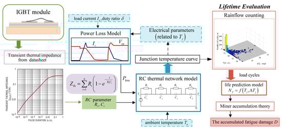 As depicted in Figure 5, two major steps are comprised in the reliability evaluation of IGBT modules: the junction temperature estimation and the lifetime evaluation. Firstly, the RC parameters within the thermal model are derived by analyzing the transient thermal impedance curve provided in the IGBT datasheet, and the Foster equivalent thermal network is established. Moreover, the power loss can be determined by importing the load current Ic, the duty ratio and other relevant parameters from the converter operation into the power loss model. In this case, the electric and thermal models are coupled to obtain the junction temperature. Then, load cycles extracted by the rainflow counting algorithm from junction temperature are adopted in the life prediction model and then the miner accumulation theory. Finally, the accumulated fatigue damage, a critical parameter for assessing the reliability of the IGBT module, is determined.