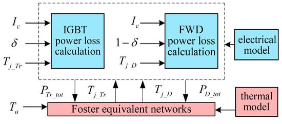 To assess the reliability of IGBT modules, the initial step involves estimating the junction temperature. In this regard, the electro-thermal coupling model is widely utilized as an analytical model. The electro-thermal coupling model, depicted in Figure 10, consists of two main components: the power loss calculation and the thermal network model. This model captures the interconnected nature between electrical and thermal properties in power devices, indicating a dynamic interaction effect between electric parameters and junction temperature.
