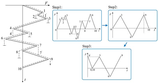 The load-time process curve data are rotated by 90°, with the vertical coordinate representing time and the horizontal coordinate representing load. The trace connecting point 1 to point 10 forms the original load curve. And the method involves tracing the rain flow along each layer, starting from the peak and valley values indicated by the dotted line in Figure 13. In this paper, the junction temperature profile is analyzed using this method to count the number of cycles (ni), the junction temperature swing (ΔT), and the mean junction temperature (Tj_m). Each temperature cycle is characterized by three points and can be categorized as minor or major cycles based on the swing and average value. In the first step, minor cycles (1-2-1′, 4-5-4′, and 7-8-7′) are extracted, and the corresponding ΔT and Tj_m are recorded. The points composing the minor cycles are then removed. Subsequently, the waveform is restructured in steps 2 and 3 to identify and save the ΔT and Tj_m values for major cycles (9′-0-3, 3-6-9). Finally, these data are used in the life prediction model to evaluate the reliability of power devices [46,47].