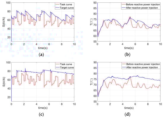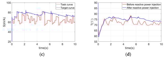 In this scenario, the junction temperature and lifetime of the IGBT module are related to the equivalent RC time constant . The specific implementation involves modifying the equivalent RC parameters while keeping the test curve unchanged. In addition, the amount of reactive power injection is adjusted by varying the equivalent RC parameters. The process ensures that the active power ranges from 40 kW to 80 kW while the reactive power remains fixed at 20 kVA. The adopted of Figure 17a and Figure 17c correspond to 5 s and 40 s, respectively. In Figure 17a, the task curve displays a maximum output power of 79.88 kW and a minimum output power of 42.57 kW. Moreover, the target curve has a fluctuation value of 24.64 kW. This reveals that the algorithm reduces the output power fluctuation by 33.96%. In Figure 17c, the task curve and target curve depict a power fluctuation of 37.31 kW and 15.14 kW, respectively. In this case, the algorithm reduces the fluctuation by 59.42%. Furthermore, Figure 17b and Figure 17d illustrate the junction temperature profiles corresponding to Figure 17a and Figure 17c, respectively. In Figure 17b, the junction temperature before reactive power injection reaches a maximum of 77.41 °C and a minimum of 66.41 °C. In addition, the ΔT of junction temperature after injection refers to 9.76 °C. It reveals that the algorithm reduces the fluctuation of junction temperature by 11.27%. Similarly, in Figure 17d, the junction temperature before and after reactive power injection has a ΔT of 11 °C and 4.83 °C, respectively. In addition, the algorithm successfully achieves a reduction of 56.09% in the fluctuation of the junction temperature.